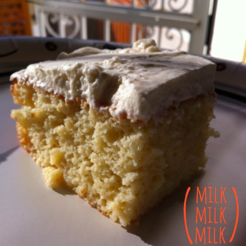 The man chefs made Mexican brunch today (nom nom nom), so this lady baker opted for a classic Mexican cake to bring for dessert. I’ve made tres leches a time or two before, but this was by far the fastest (most recipes call for a multi-hour soak!) & most successful. The cake was so spongy that it sopped up lots of liquid in a relatively short amount of time, and I know it’ll be even better tomorrow!