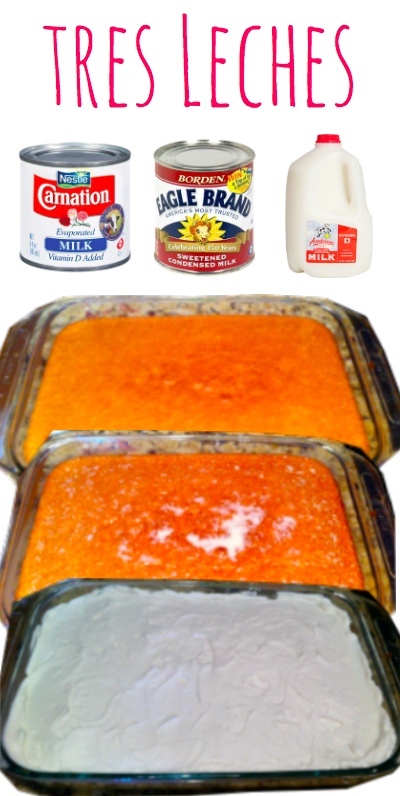 Let your cake cool & then poke holes in it with a fork. Combine 1/4 c heavy whipping cream, evaporated & condensed milks in a pitcher & pour it all over the cake watching it slowly sopp up all this sweet milky mixture. Let that cake relax and make your whipped cream topping. I made a simple whipped cream with 3 tbl. sugar, 1 pint heavy whipping cream, and vanilla & cinnamon to taste. Try to be as patient as possible to let the flavors absorb, but slice this baby whenever you please.