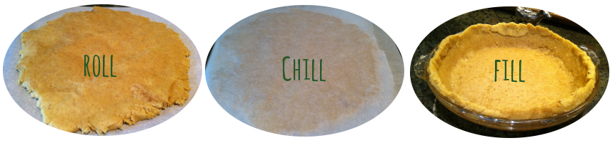 Let’s start with the crust, shall we? First pulse your cup of pecans & sugar in a food processor; pulse until it’s a fine meal. Add flour, butter & salt and continue to pulse until the butter is super crumbly. Then add the eggs and half & half. Once your dough is in a nice ball, flatten it out between two pieces of parchment paper. Chill in the fridge until you’re ready to bake it. When it’s time to bake, roll or use your hands to fit your crust into a pie pan. Be sure to poke your crust with a fork (many, many times) and then bake for ~20 minutes at 350. I covered mine with parchment paper. True story, I didn’t have pie weights and my crust definitely rose a little. Once it got out of the oven, I needed to smoosh it back down to its home in the pan. Remove once it’s golden brown.