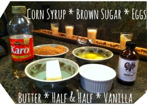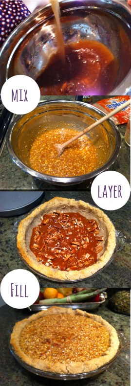 While your crust is baking is the perfect opportunity to make your filling! Setup a double boiler and melt your butter. Then mix in your sugar & salt. Then beat in eggs, corn syrup, and vanilla. Pop your bowl back on your double broiler & stir, stir, stir until your mix is shiny and warm. Remove the bowl from the heat & stir in your 2 cups of toasted chopped pecans. Ta da! You have filling.