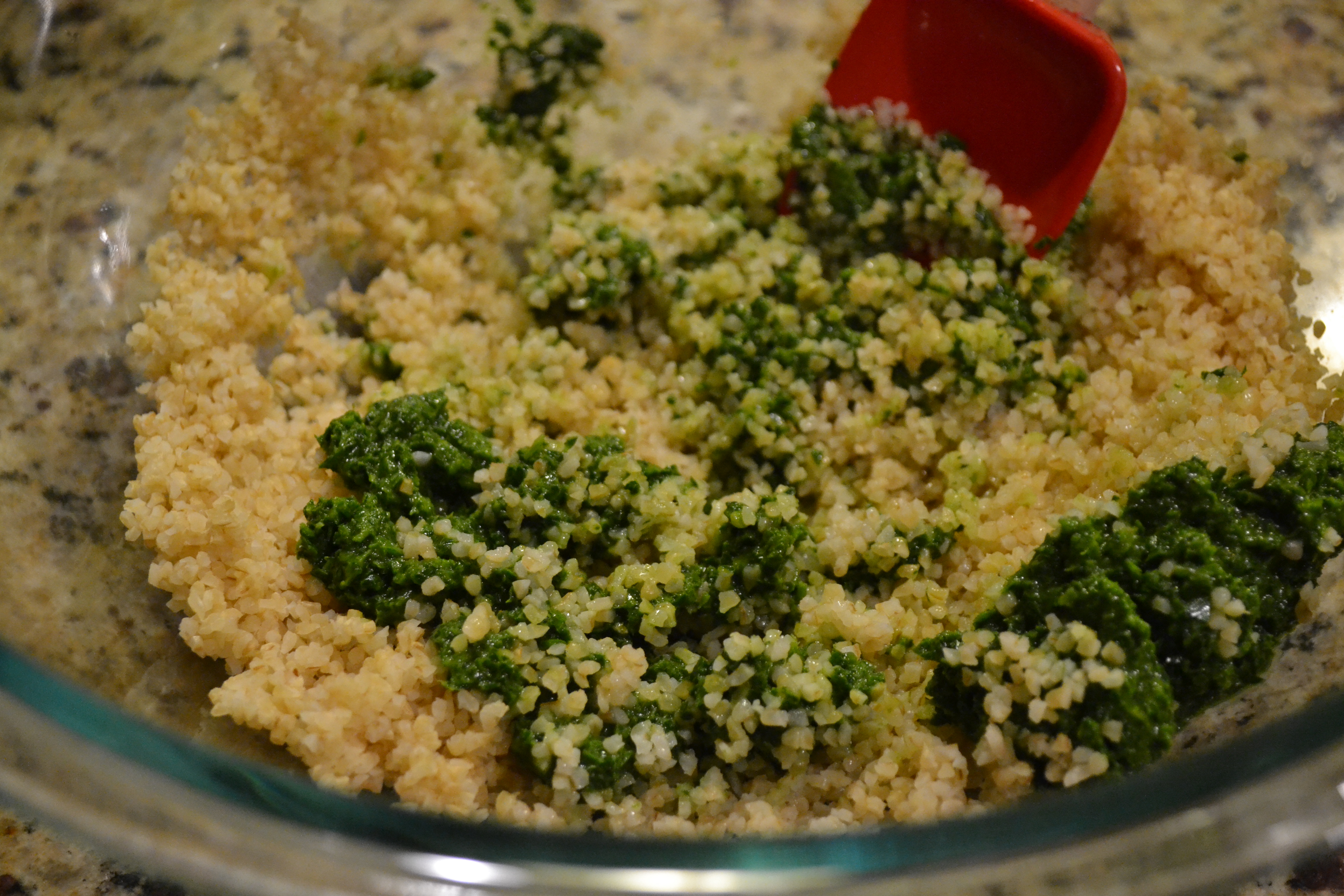 Once your bulgar is adequately soaked, pour in your green mixture and stir to combine.